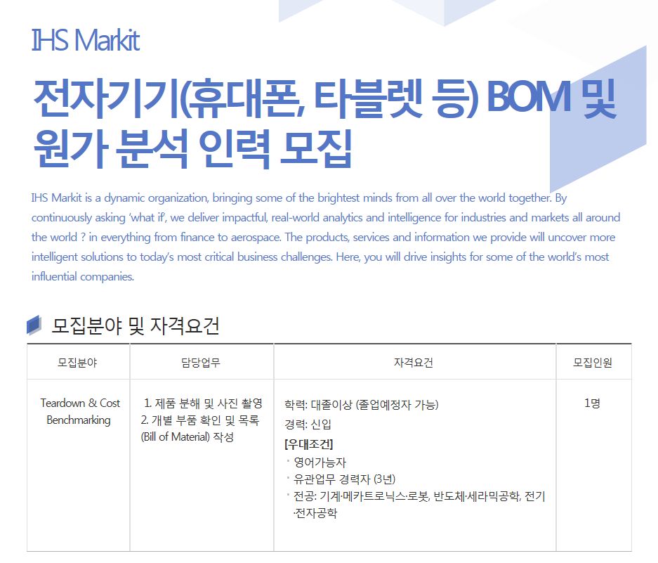 (외부채용)아이에이치에스마킷코리아㈜ 전자기기 BOM 및 원가 분석 인력 모집(~10/31) 2018.10.05. 13:56 김해리 (hr****) [참고사이트] # http://www.jobkorea.co.kr/Recruit/GI_Read/26368786?Oem_Code=C1 # https://www.peoplenjob.com/jobs/3529794?field=all&q=IHS 인쇄